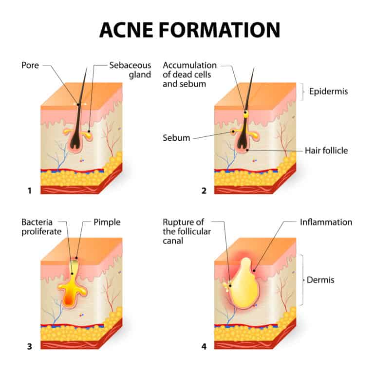 Acne is a common skin condition that occurs when pores become blocked with sebum, skin cells, and bacteria. It occurs mainly on the face, chest, upper back, and shoulders – the areas of skin with the most oil (sebaceous) glands. The oil glands (which are connected to hair follicles) release oil that travels up the hair shaft to clean and clear away dead skin cells from the pores, keeping skin clear. However, when the skin’s pores become clogged the excess oil, dead skin cells, and other debris become trapped and build up inside the pores causing whiteheads and blackheads to appear. Acne-causing bacteria feed on the oil and dead skin cells within the pores and as they grow this contributes further to the increased pressure within the pore.