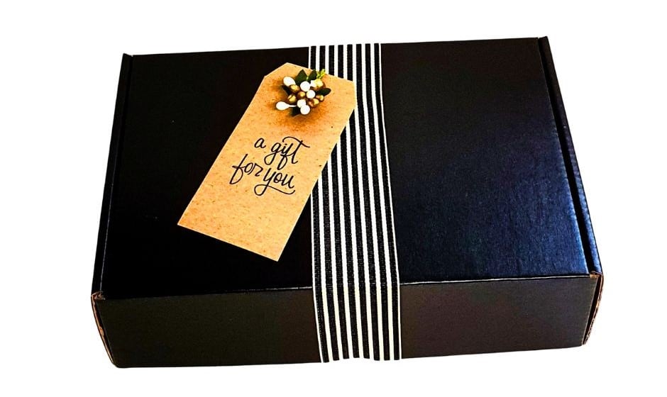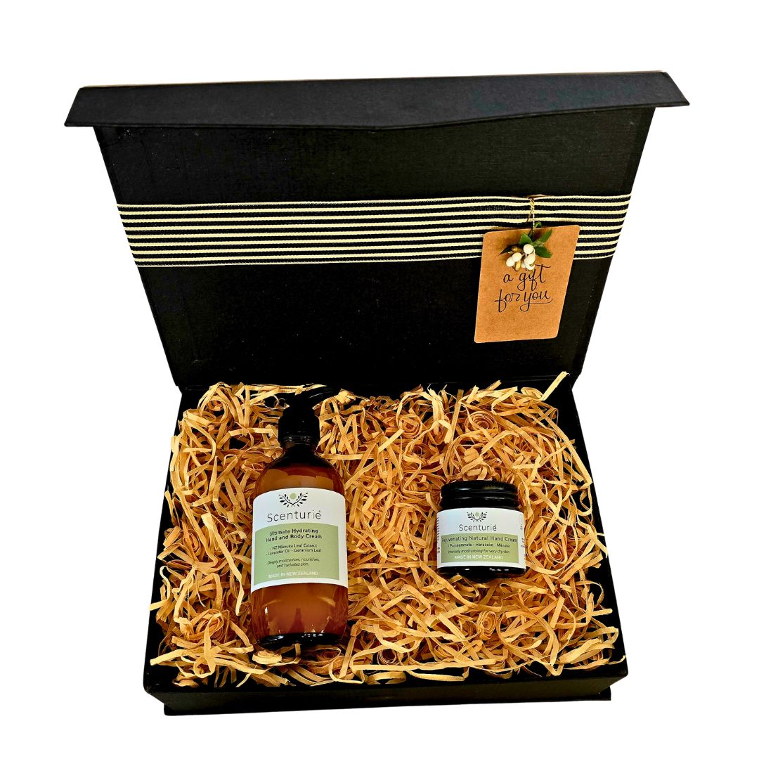 Set includes: One Ultimate Hydrating Hand and Body Cream (175g), one Rejuvenating Natural Hand Cream (60g), a quality black gift box, wood wool, ribbon, and gift tag.