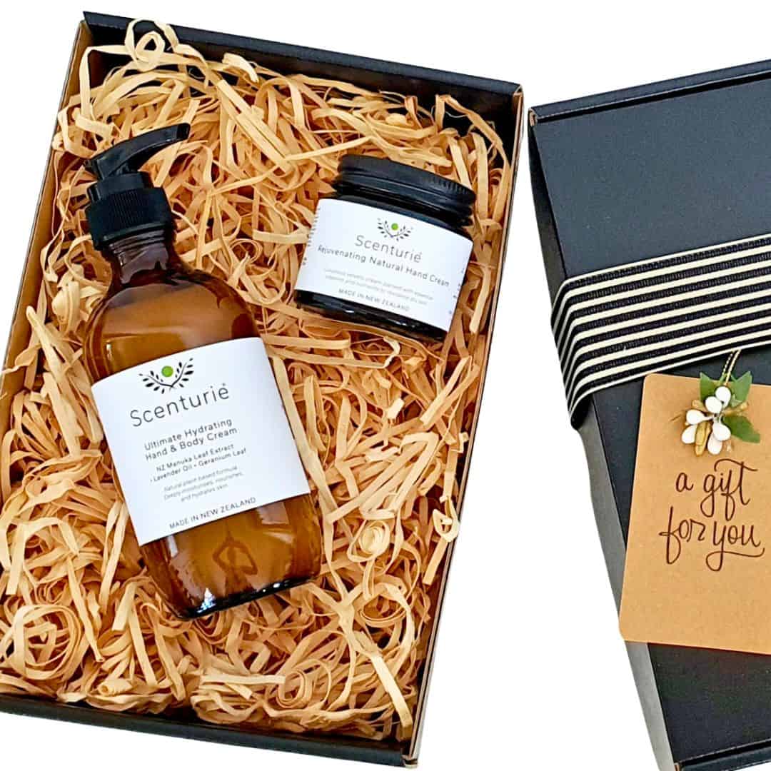 Our Hand and Body Cream Gift Set, made with NZ native extracts, pure nourishing plant oils, and essential oils, will delight her senses and nourish her skin. Set includes: One Ultimate Hydrating Hand and Body Cream (175g), one Rejuvenating Natural Hand Cream (60g), a quality black gift box, wood wool, ribbon, and gift tag.
